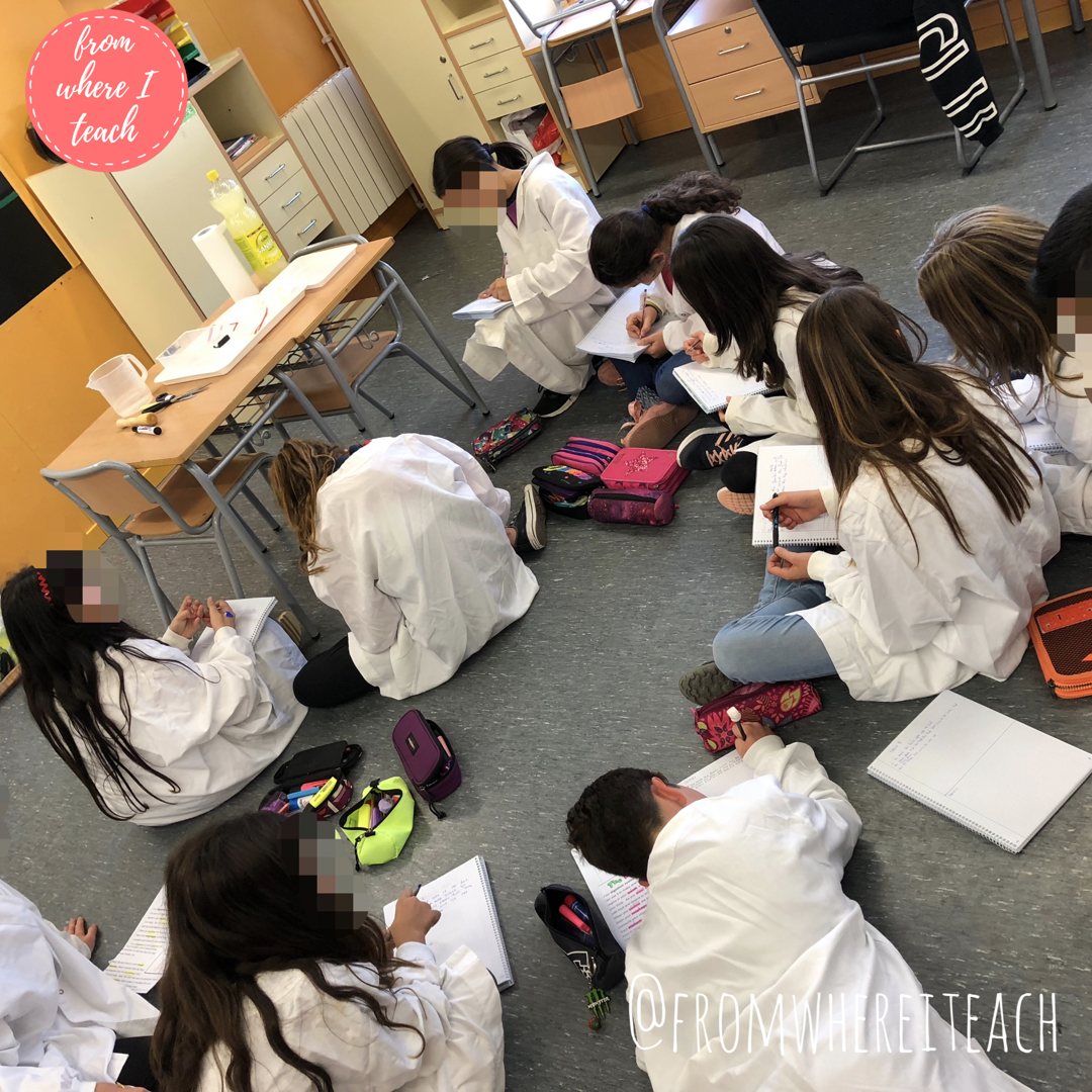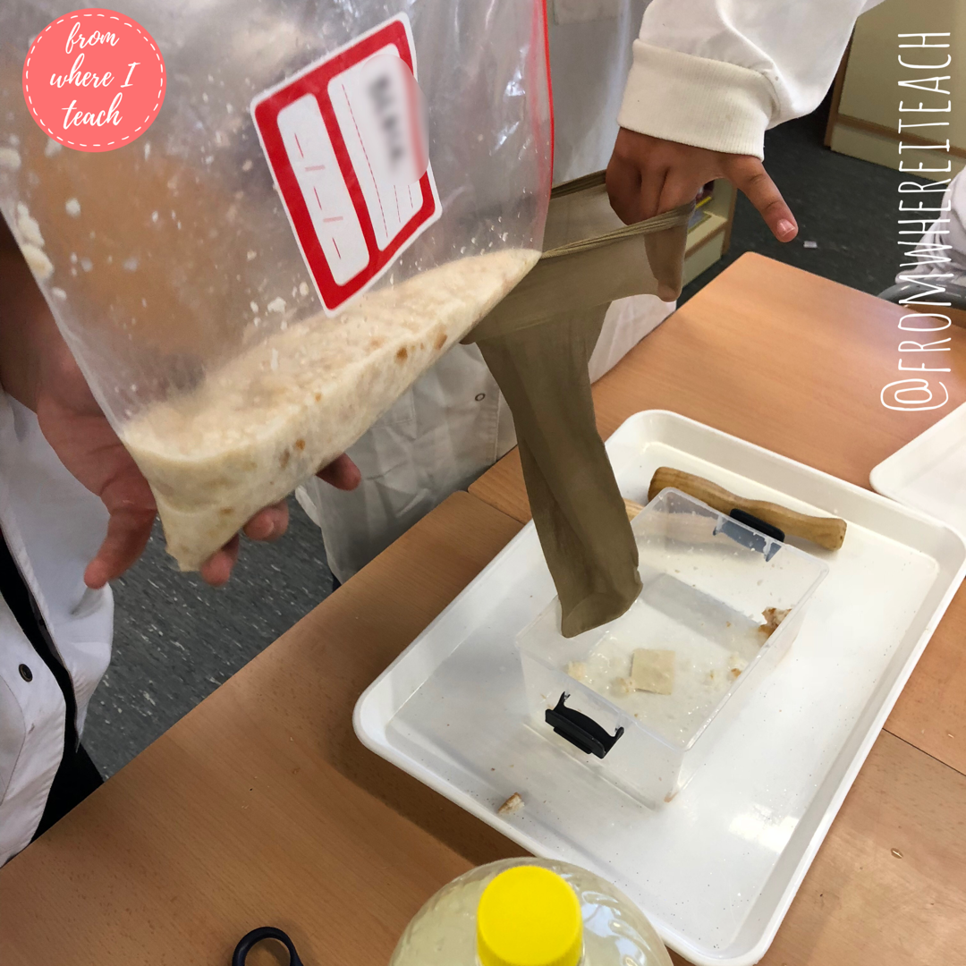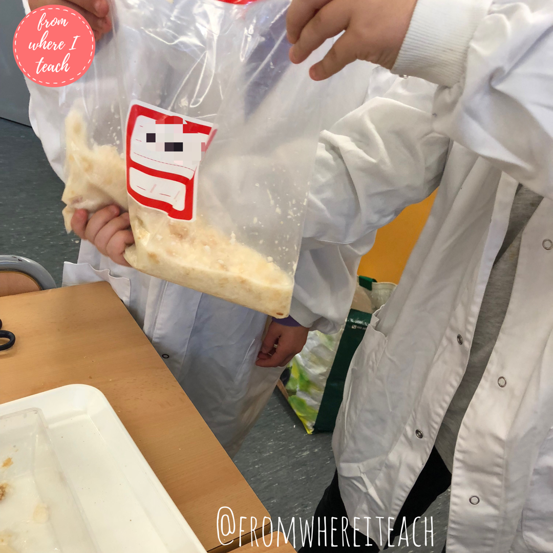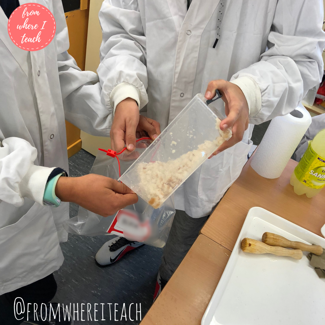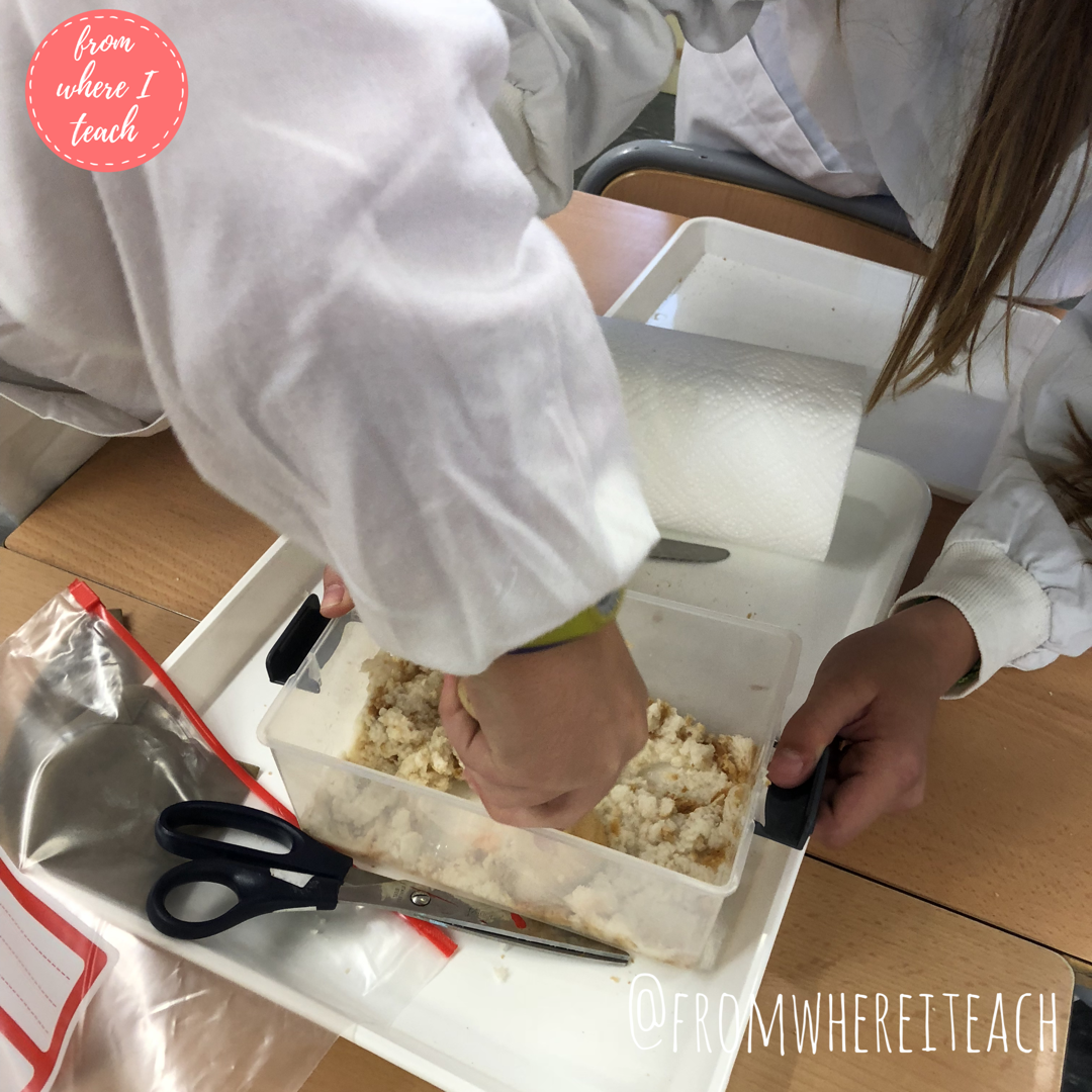 Bueno, al lío! Primero hicimos una mini lesson en el aula sobre la digestión, explorando sus ideas previas e introduciendo el vocabulario básico, y viendo un breve vídeo sobre el proceso digestivo. Después bajamos al science lab y nos distribuimos en dos grupos para trabajar en dos estaciones de unos 15 minutos de duración cada una.