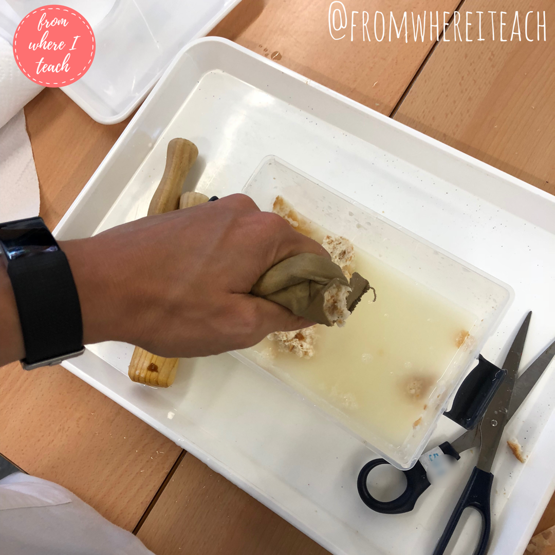 En la siguiente estación trabajaban conmigo en un modelo de la digestión para hacer el proceso más visible y sobretodo, más concreto y memorable para ellos. La idea la conseguí el año pasado a través del blog Homeschool Room, le hice unas poquitas adaptaciones para “scaffold” el proceso a nivel lingüístico, y fue un exitazo. Tanto que algunos de mis alumnos que tenían hermanos que lo hicieron el curso pasado se emocionaron al ver que ellos iban a hacer lo mismo! Os cuento cómo funcionaba.