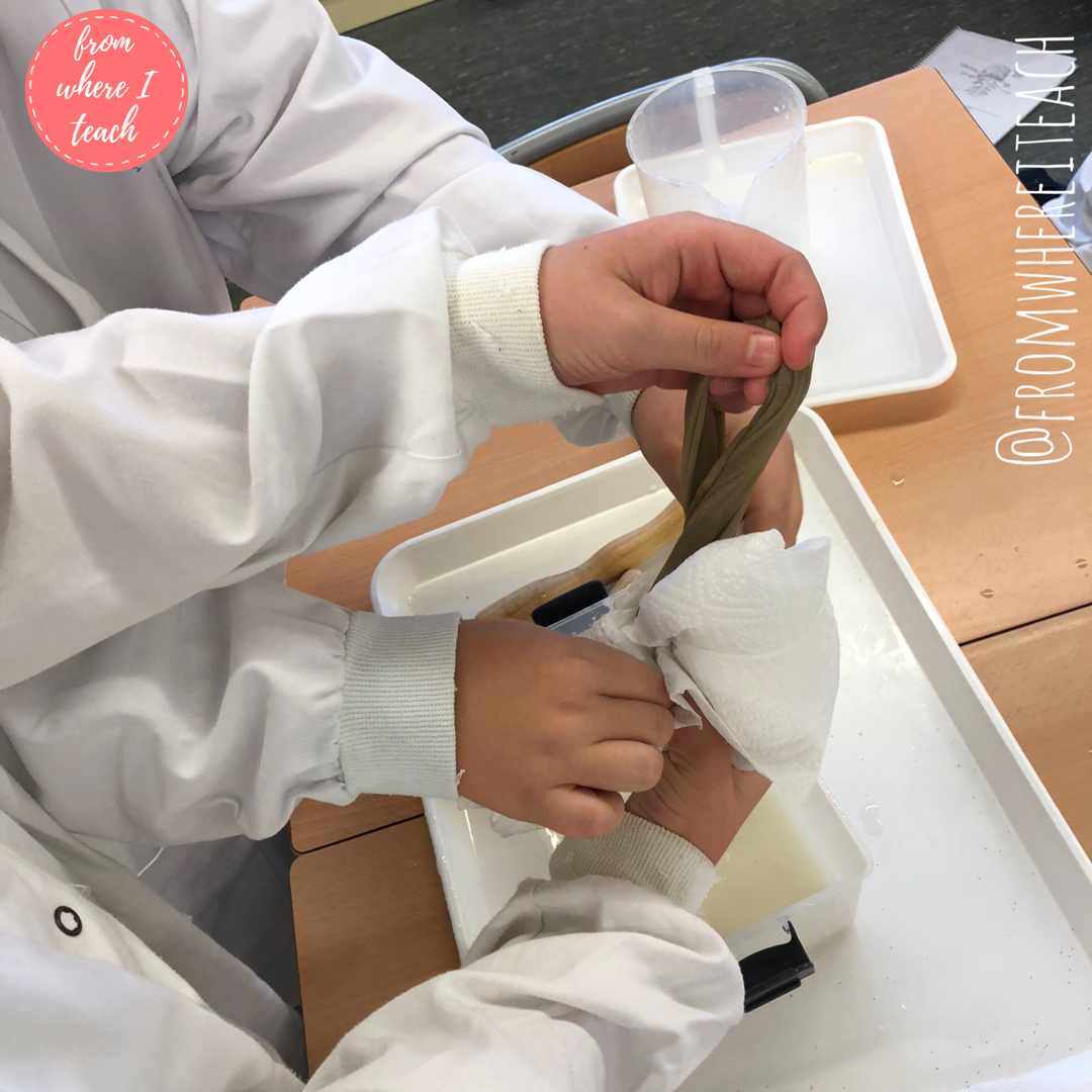 Primero, los alumnos se ponen sus lab coats como buenos científicos. Tenemos uno para cada uno gracias a una mamá de la escuela!